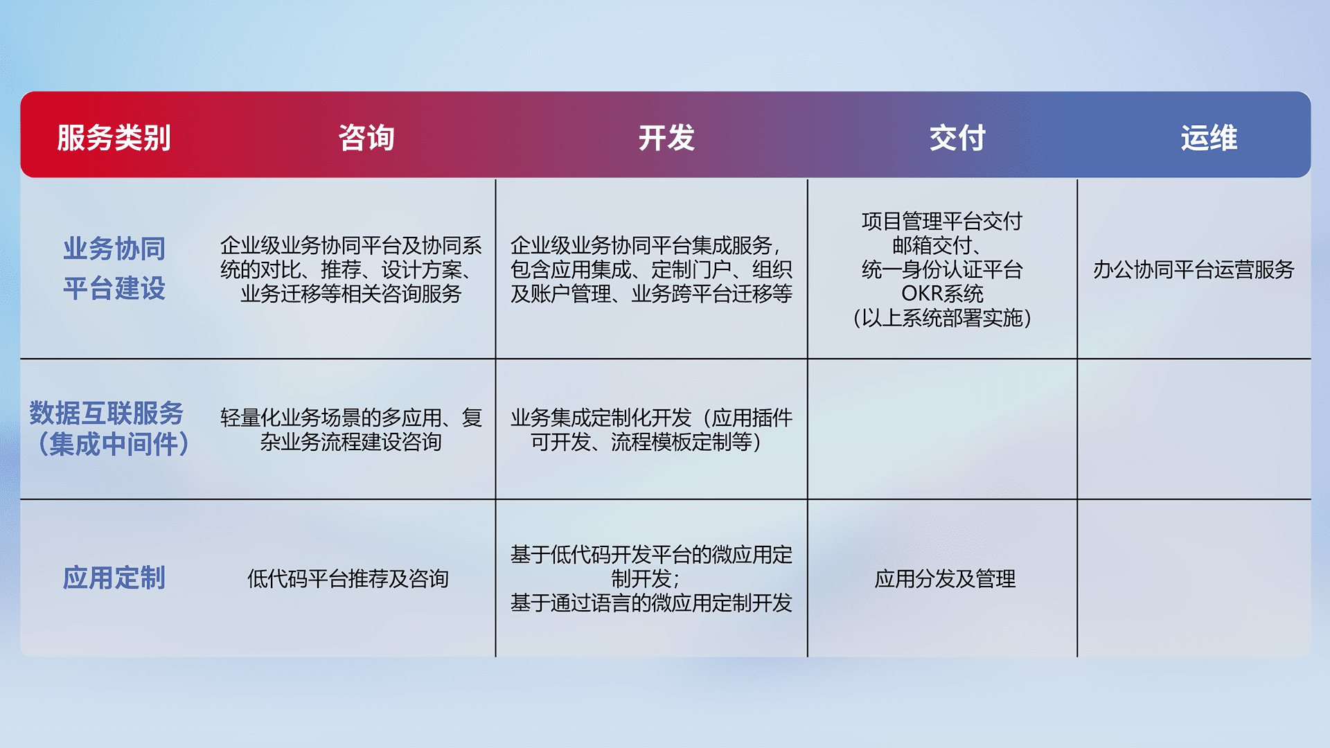 针对钉钉、、企微、、、IDaas等平台级产品提供产品的规划、、方案、、交付、、定制化开发等服务,,,实现如统一协同办公、、、、智能客户服务、、混合会议管理、、智能数据查询、、等业务场景,,,实现数字化转型。。。。